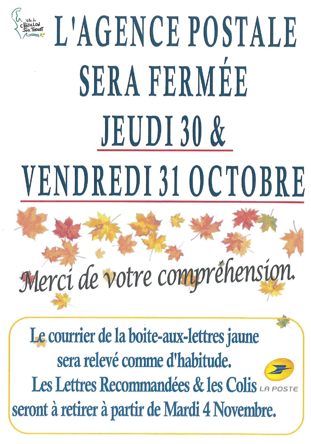 L'agence postale sera fermée le jeudi 30 et le vendredi 31 octobre 2025.