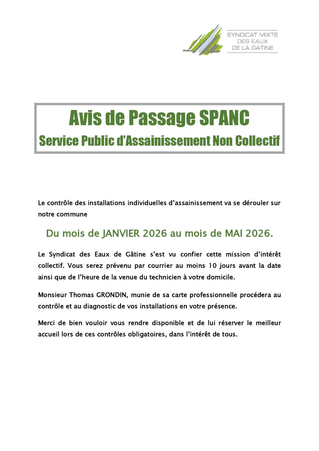 Merci de vous rendre disponibles et de lui réserver un bon accueil. Ces contrôles sont obligatoires et essentiels pour garantir un assainissement conforme et durable pour tous.