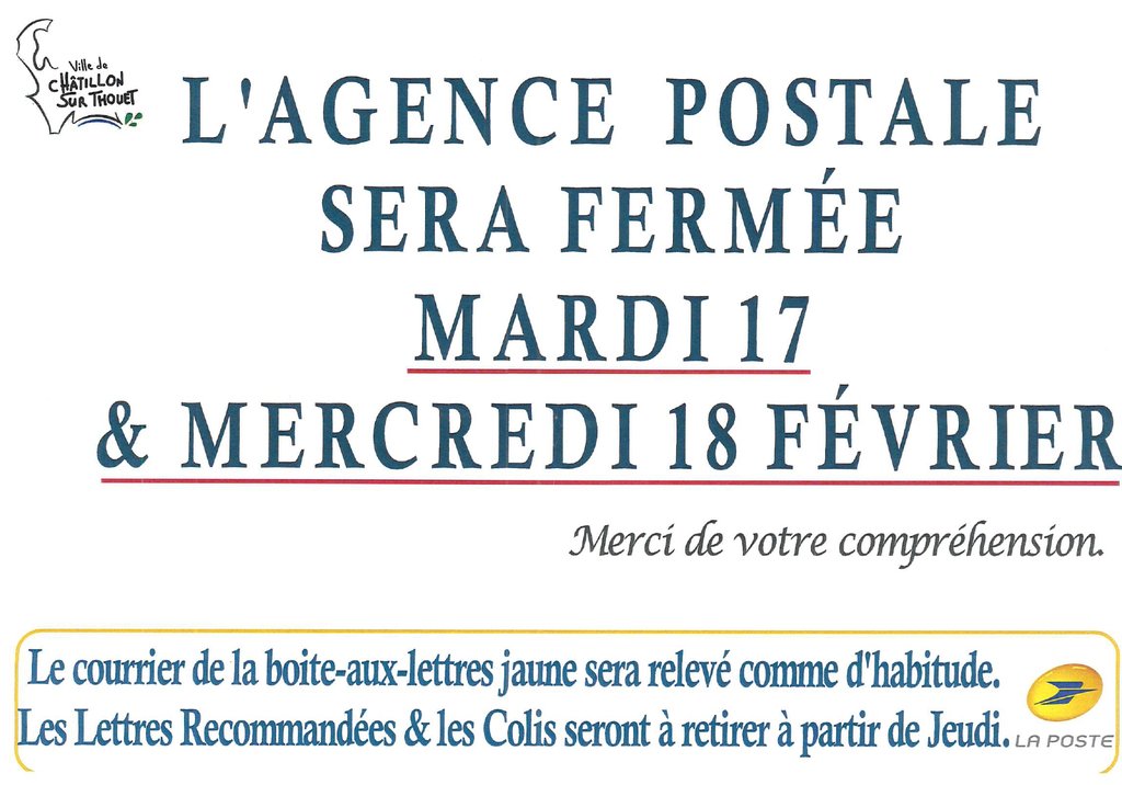 L’agence postale sera exceptionnellement fermée mardi 17 et mercredi 18 février.