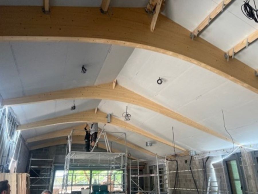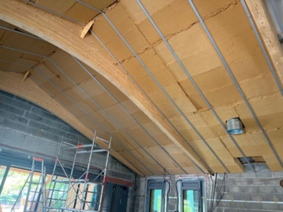 L'isolation du toit est mise en place puis recouverte par les plafonds :