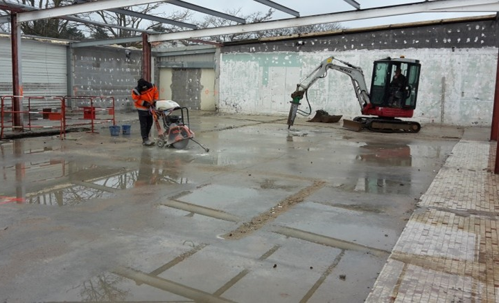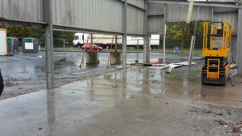 Les barrières de chantier délimitent la zone de travaux et les démontages intérieurs ont débuté.